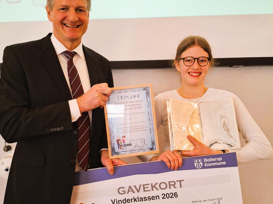Borgmester Jesper Würtzen stod klar til at overrække diplom og vandrepokal, da vinderen skulle kåres. Vinderen blev Augusta Bjerregaard fra 6.F på Måløvhøj Skole, afdeling Østerhøj.