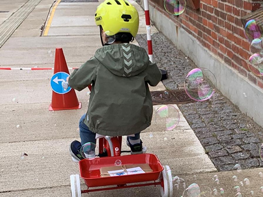 Vi finder børnebibliotekets små cykler frem og giver alle små cyklister en udfordring: Kan I hjælpe frøerne med at finde deres venner i de rigtige farver?