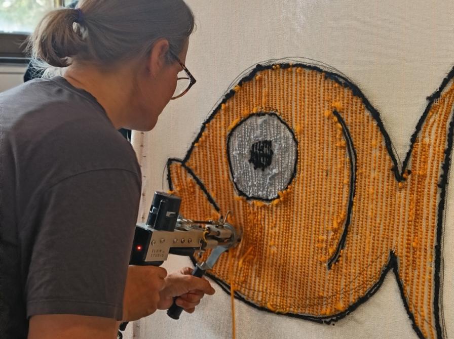 Der er tufte-maskiner til rådighed til alle deltagere, og Cecilie guider alle igennem, hvordan maskinerne bruges, og hvordan man kan lave sine egne flotte og tuftede værker.
