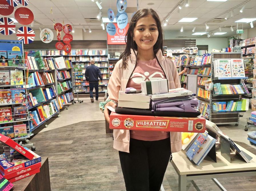 Vasudha valgte bl.a. brætspillet Vildkatten, tegneudstyr og bøgerne ’Alice i Eventyrland’, ’ Percy Jackson & lyntyven’ og ’Tom Sawyers eventyr’ af Mark Twain. Solide bogvalg, må man sige!
